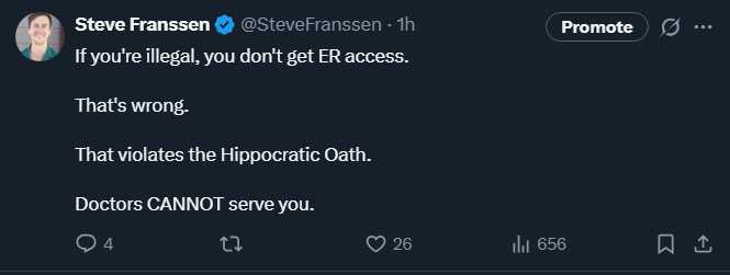 First, it's topical because I think JD Vance said something to the effect of "illegals shouldn't be served by US ER staff" though I didn't verify because I don't really care for Vance and don't want to absorb his words. But his words ARE getting a lot of play right now.